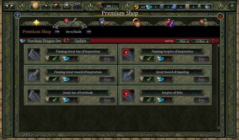 遊戲內設有商城,提供玩家買更好的裝備道具,遊戲一開始的新手介紹完畢後,有提供一點點Dragon Ore,算是遊戲商城專用的點數,蛙一開始就拿去買了思克巴妹了(笑~),如果覺得一開始提供的Dragon Ore 不夠多,可以點選介面上方的「BUY DRAGON ORE」,不過是國外的網頁遊戲,目前還是只能用信用卡吧。